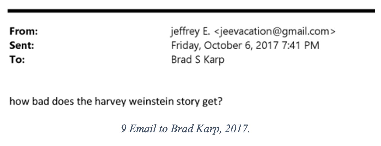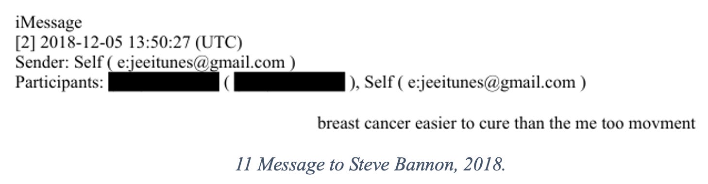 Epstein didn’t face these woes alone, though. After advisor Steve Bannon left the White House in 2017, Bannon and Epstein messaged frequently, strategizing, quoting movies, and giving back-channel insights into the news. As MeToo refused to let up, Epstein and Bannon collaborated on neutralizing the threat – because that’s what survivors coming forward posed.