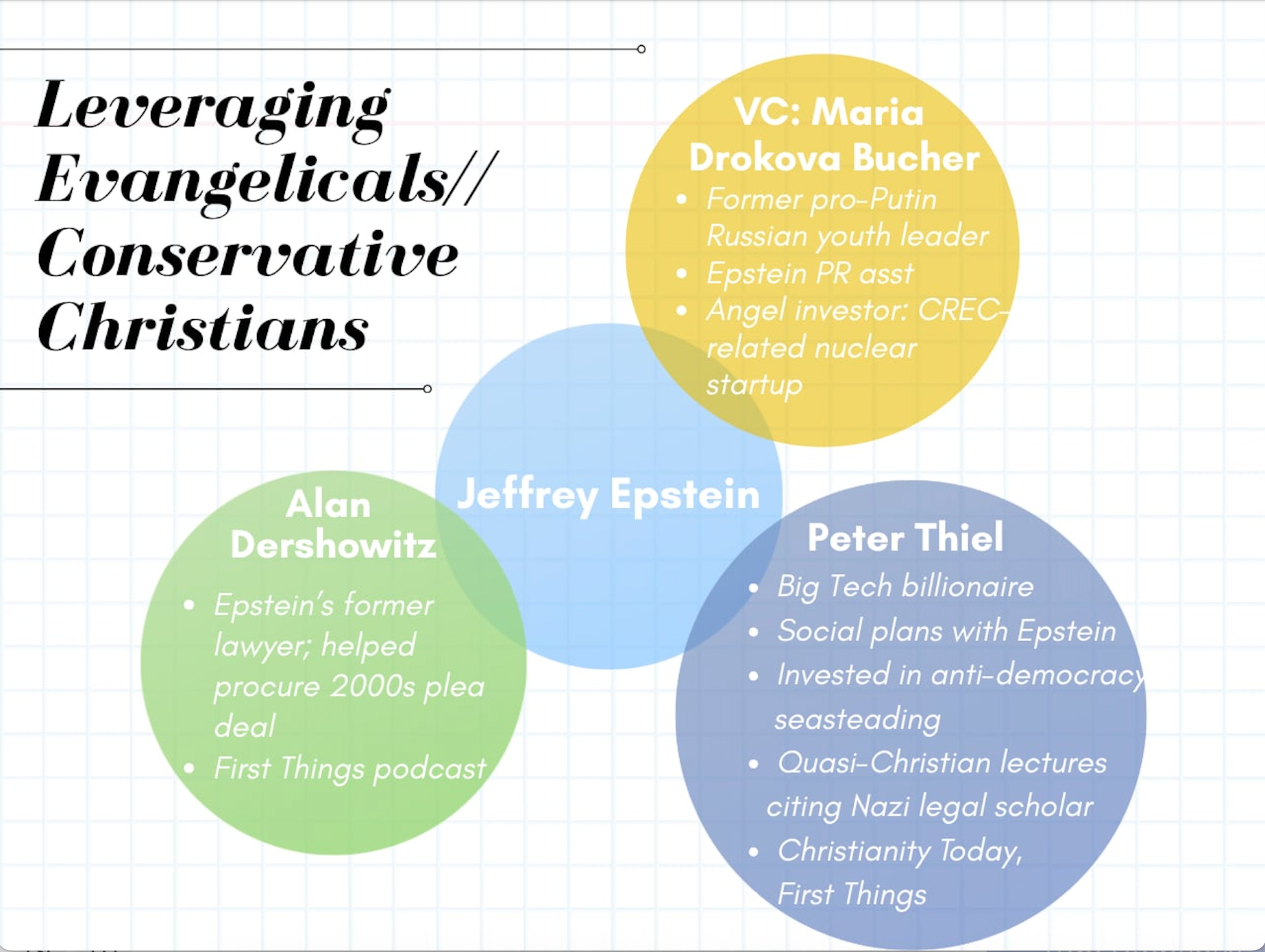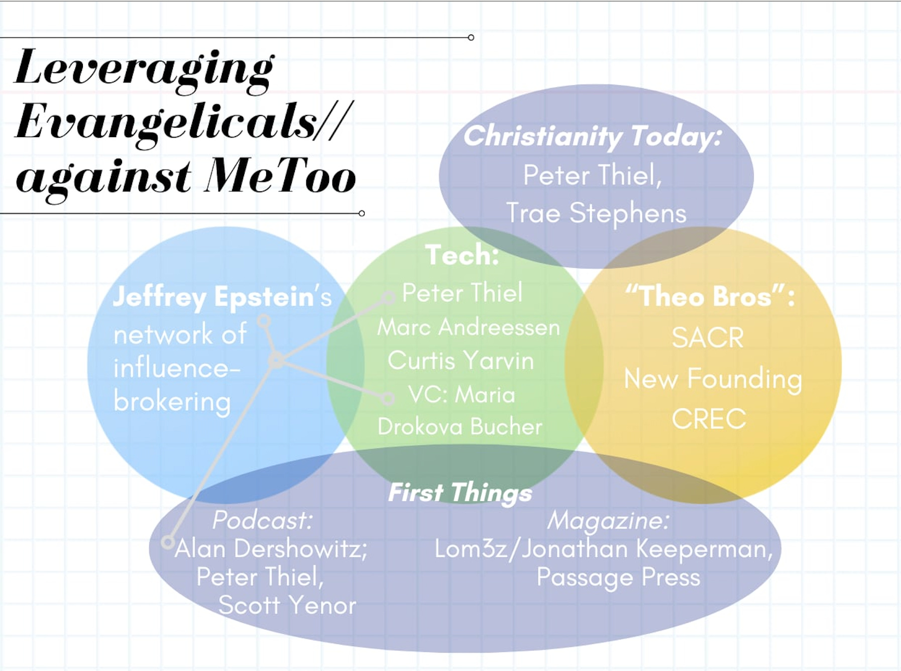 · 2023: Late Father Richard John Neuhaus’ previously serious First Things ran a “longhouse theory” essay critical of women written by a publisher of white supremacists. Peter Thiel, Alan Dershowitz, and anti-feminist SACR member Scott Yenor have been guests on FT’s podcast. Thiel, the gay, patriarchal mentor to JD Vance, lamented “the extension of the franchise to women” in a 2009 essay describing democracy and freedom as “incompatible.” Dershowitz was one of the attorneys to secure Epstein’s Florida plea deal. Magazine donors of $50,000+ receive “personal editorial briefings.”