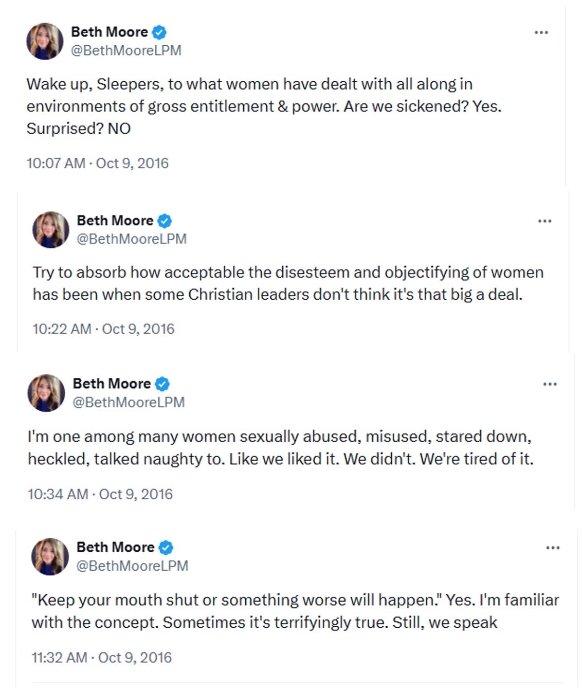 In October 2016, at the outset of MeToo, Beth Moore posted: