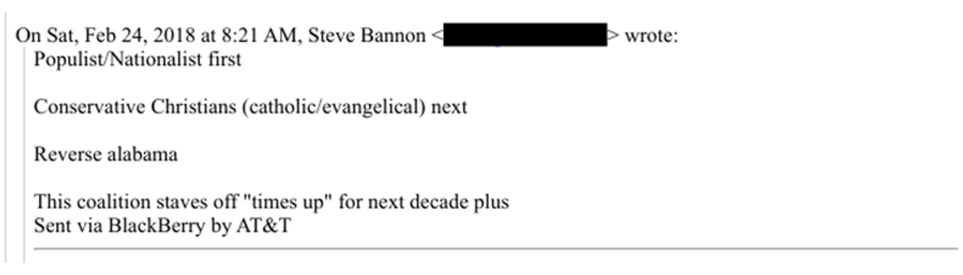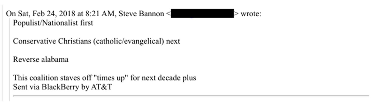 Steve Bannon’s big-picture political strategy to “stave off” MeToo and Time’s Up? Establish a new coalition leveraging conservative Christians to block accountability and justice for exploitation, assault, harassment, or trafficking. (“Reverse Alabama” may refer to JFK’s enforced integration of Alabama schools or the Roy Moore debacle.)